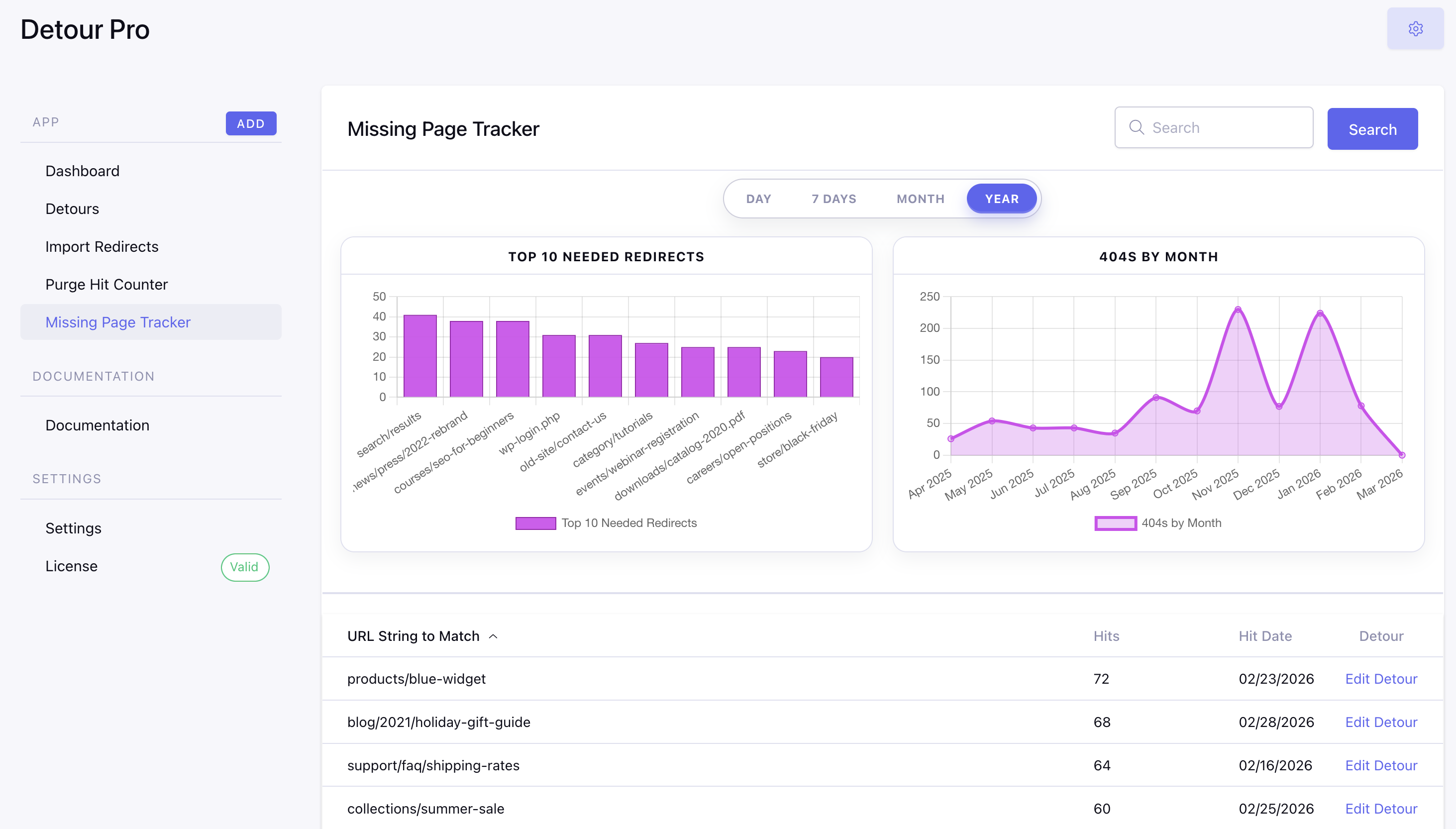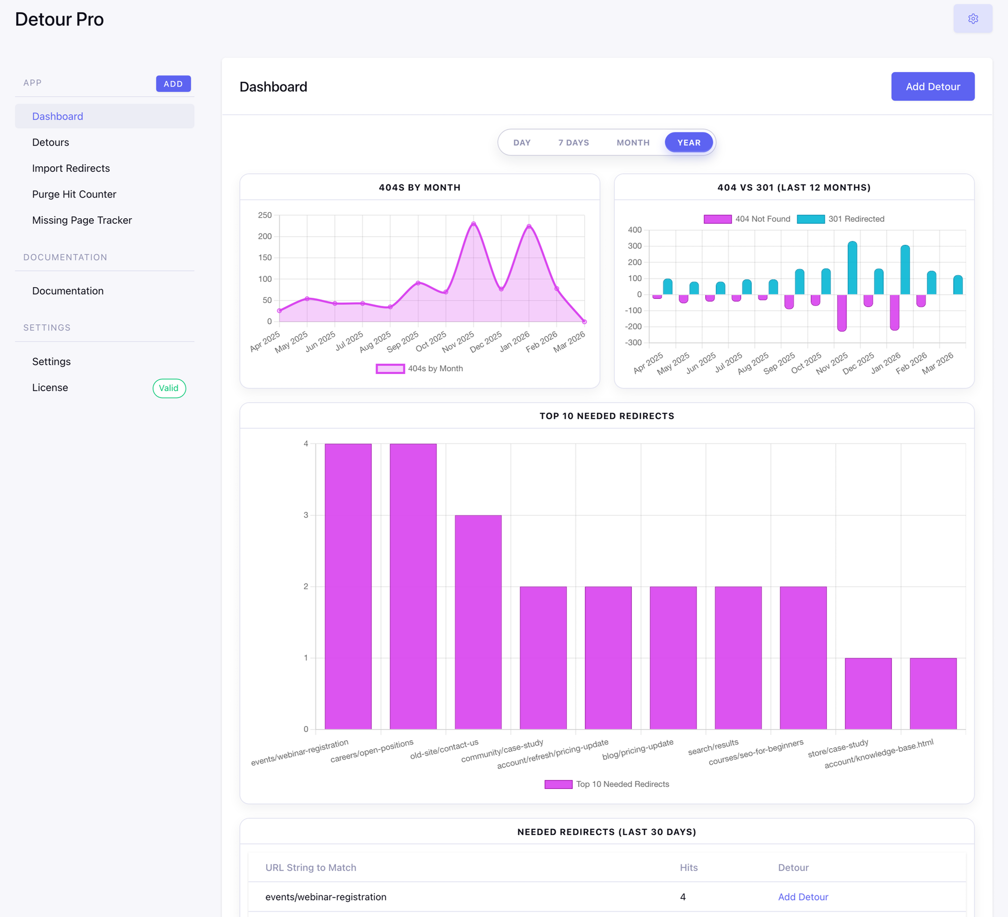 The standout: Top 10 Needed Redirects. This shows the most-hit 404s that don’t yet have a redirect, with a one-click “Add Detour” link for each in the table below the chart. Fix the highest-traffic broken URLs first. With the hit counter enabled, you also get 404 and 301 trend charts, a 404 vs 301 comparison, and a Top 10 Redirects chart on the Detours list.