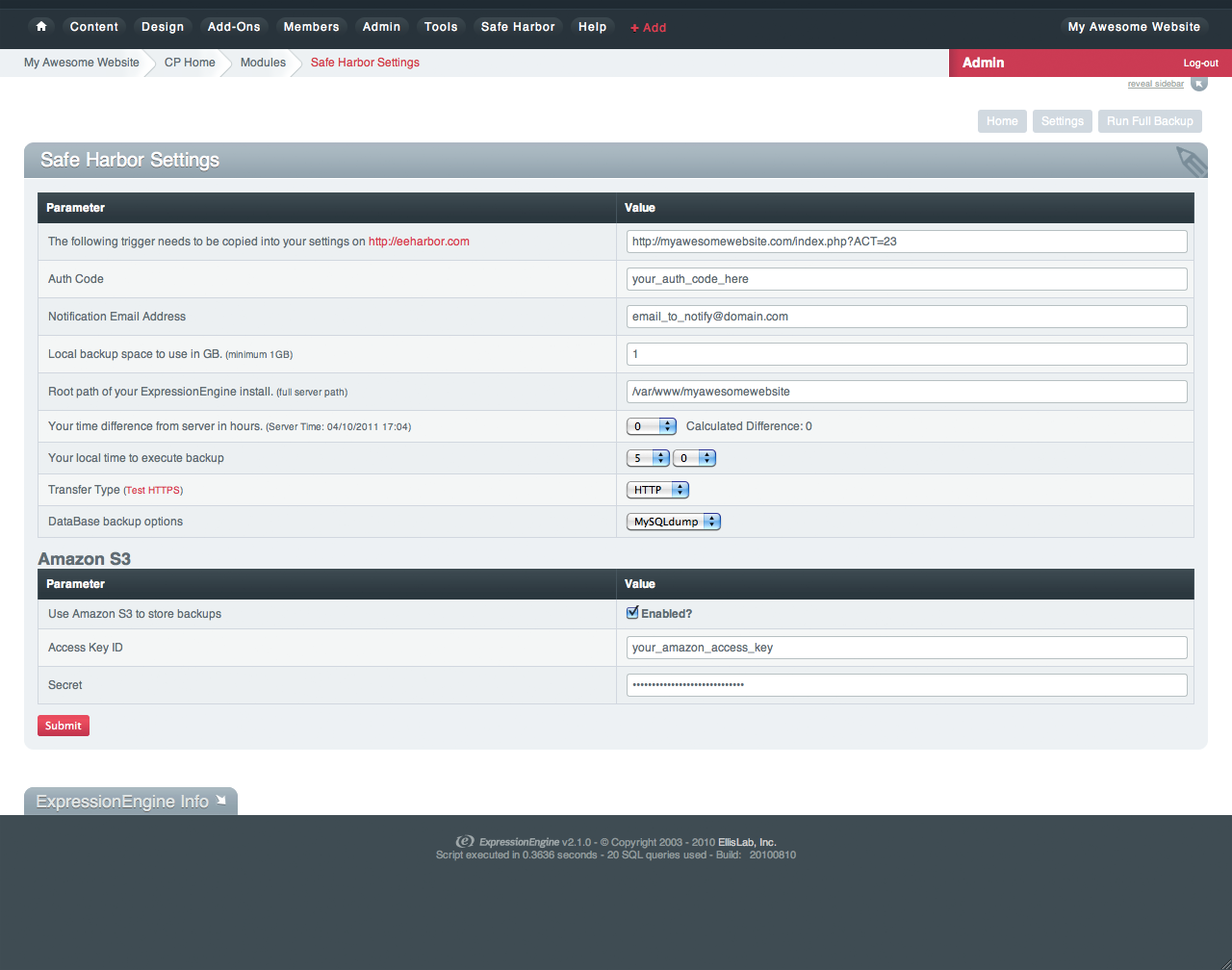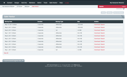 Safe Harbor provides daily backups (database and files) of your ExpressionEngine install. By default, backups are stored on your web server. You can also store backups on Amazon S3!